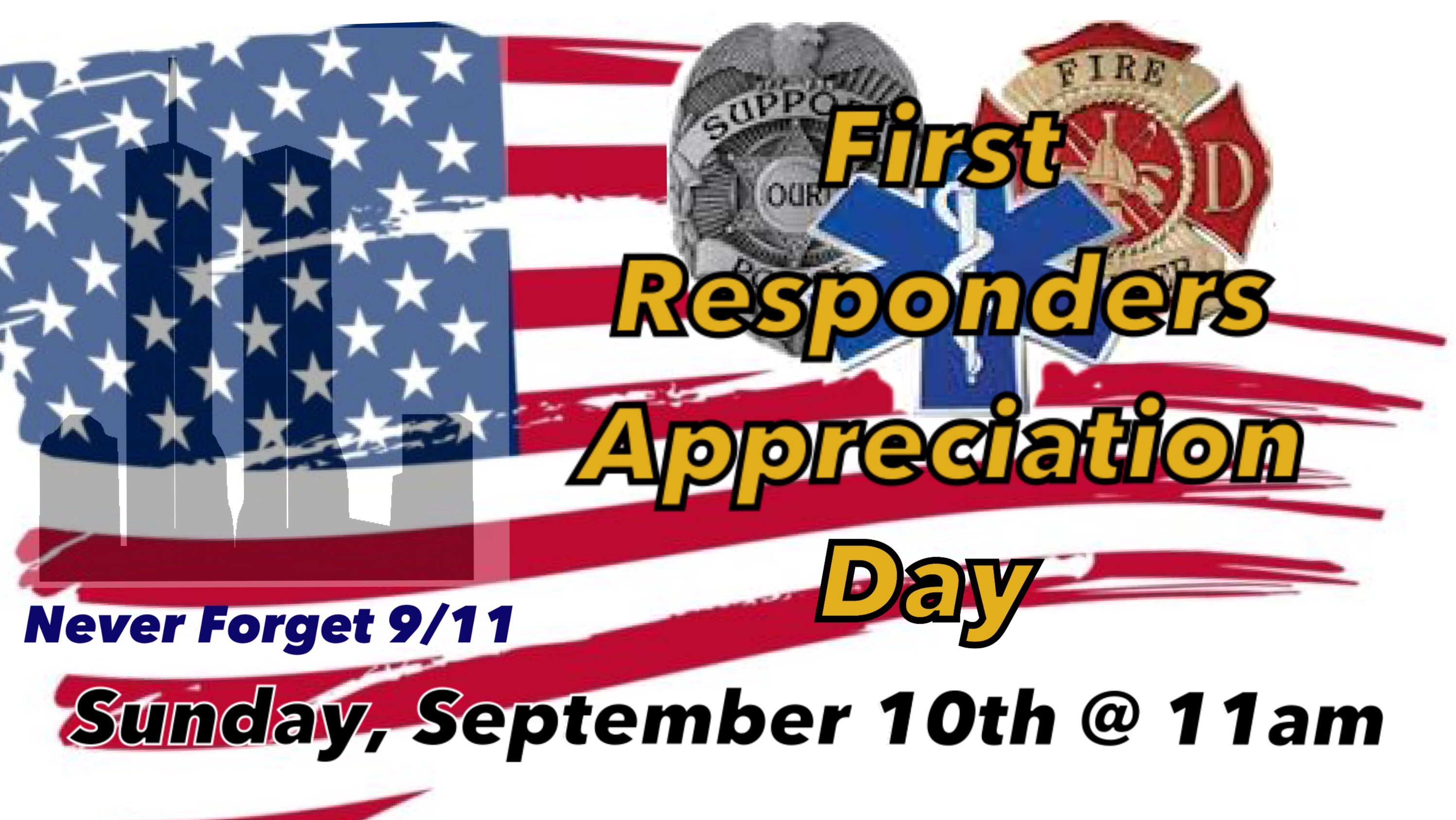 Sunday, September 10th First Responders Appreciation Day 29 Tuesday Aug 2017 Posted by Matt Smith in Bible ≈ Leave a comment Join us as we honor our local First esponders. Every First Responder in attendence will receive a gift. Also join us after the service for a BBQ at the Church. Share this: Click to share on X (Opens in new window) X Click to share on Facebook (Opens in new window) Facebook Click to email a link to a friend (Opens in new window) Email Like Loading... Related
